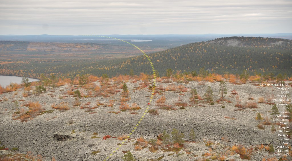 “Now it is the pandemic year 2021. I am in a fell in the northern hemisphere in Finnish Lapland. I open the satellite tracking application and select a moving point on the screen, confirm the direction, and try to walk for a short time with that moving point. The vertical distance to it is over 200 kilometers. Golden foil protects it. I am wearing a red hoodie.”